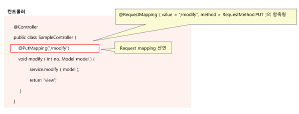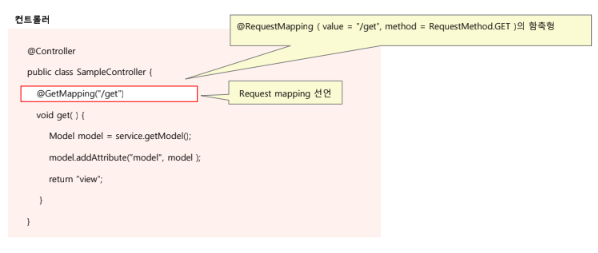 • GET 방식, POST 방식 등 전송 방식에 대한 처리를 어노테이션으로 처리한다.